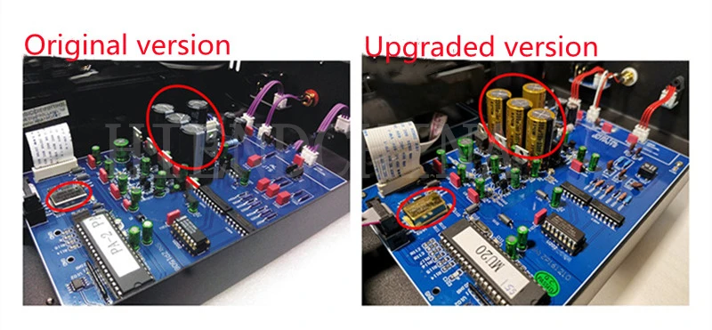 The upgraded version upgrades the following items on top of the original version, resulting in significant improvements in machine disc reading and sound quality. Four filter capacitors have been upgraded from ruby capacitors to high-quality gold FG audio capacitors from Nikon NICHICONG. 2. The crystal oscillator has been replaced with a gold plated temperature compensated high-precision active crystal oscillator.