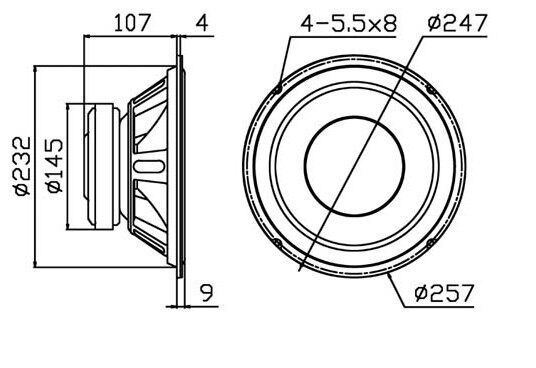 SS10 low midrange unit technical parameters:Rated Impedance: 5ΩResonant frequency: 16HzRated power: 150WMaximum power: 300WSensitivity (2.83v/1m): 90dBWeight: 3.6kgVoice coil diameter: 50mmDC resistance: 4.2ΩVoice coil width: 22.5mmVoice coil wire: high temperature resistant SV wireVoice coil frame: High temperature KaptonMagnetic circuit type: external magnetic circuitMagnet Material: High Performance FerriteForce coefficient (BL value): 12.9N/AMagnetic gap height: 8.0mmMaximum Linear Displacement: 7.3mmCompliance: 1496uM/NMechanical Q: 3.09 -Electric Q: 0.17 -Total Q: 0.16 -Vibration mass: 66.9gEquivalent volume: 279.9LBox type: phase guideRecommended net volume of box: 50LPhase tube tuning frequency: 35HzCabinet in free field -3db Frequency: 34Hz