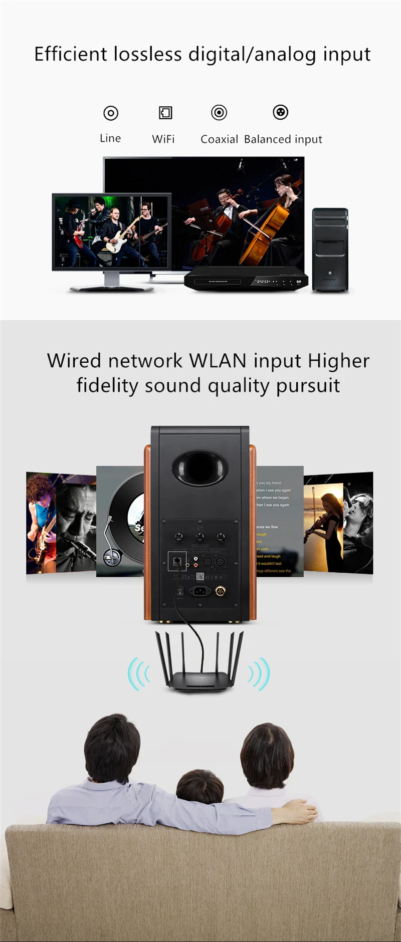 Audio input :WIFI WLAN.Bluetooth, fiber, coaxial, balanced input, Cable input